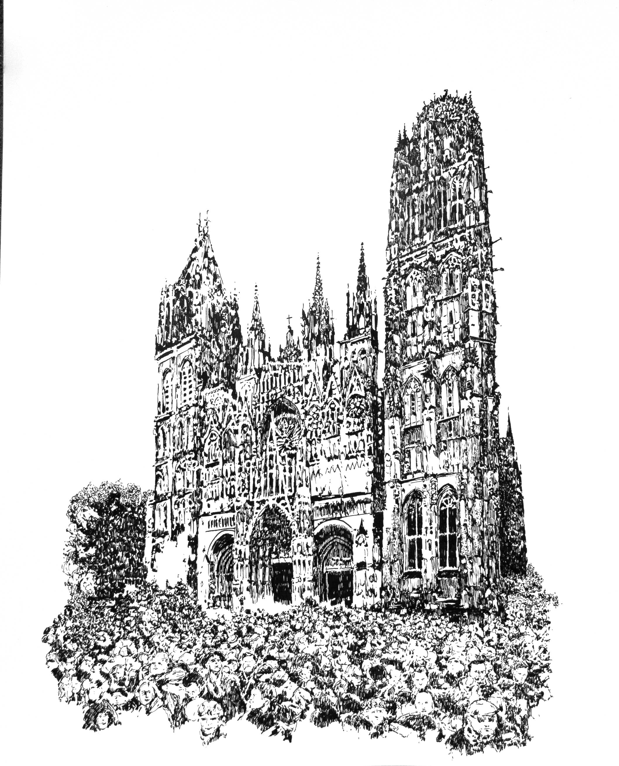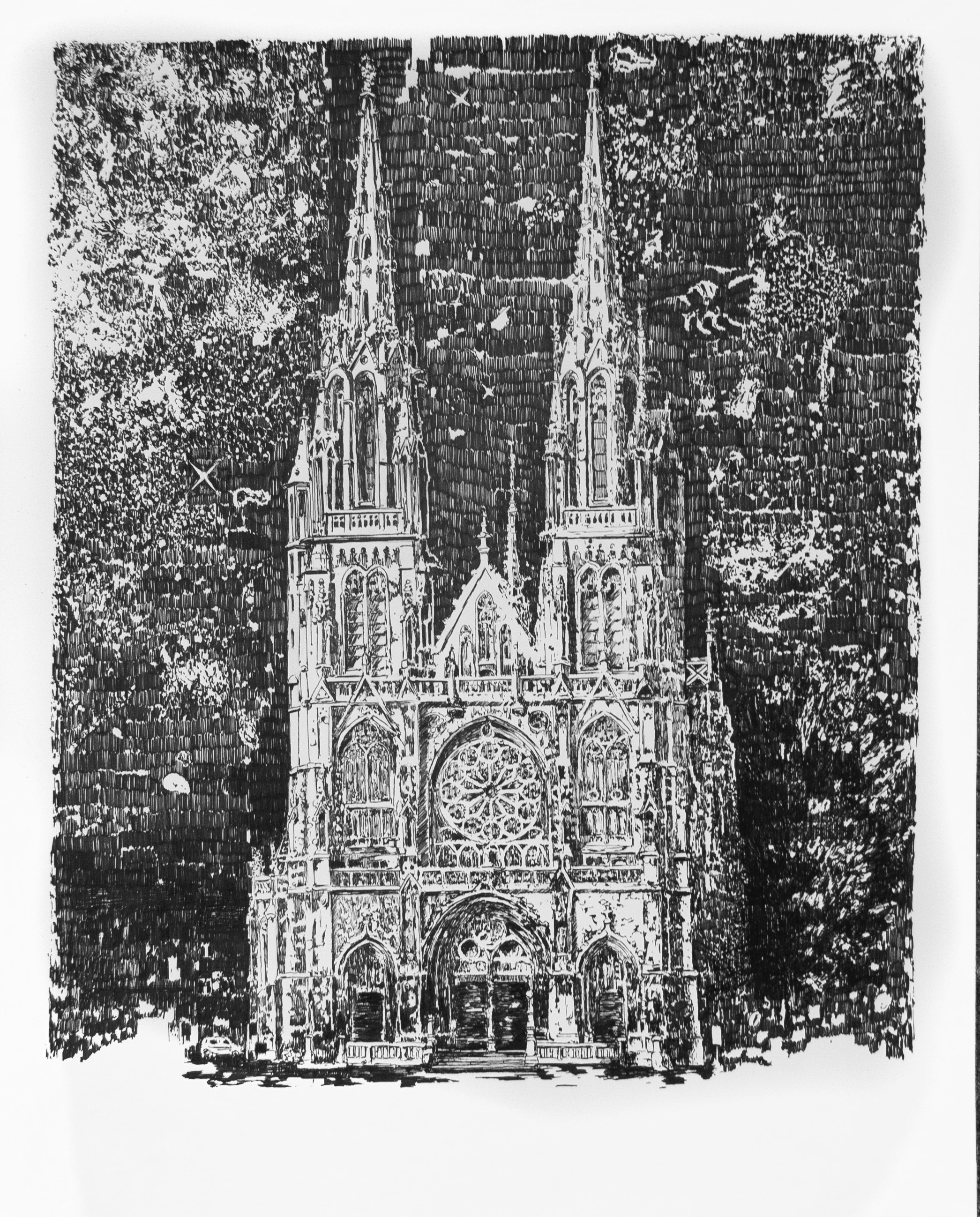 « Foule christique (The Cathedral after James Ensor)», feutre noir pigmentaire sur papier, 48 x 37 cm , 2024
